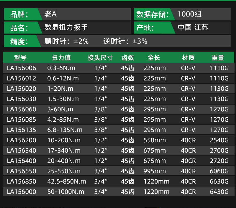 老A(LAOA)高清数显扭力扳手高精度扭矩扳手电子力矩扳手扭力表扭矩扳子
